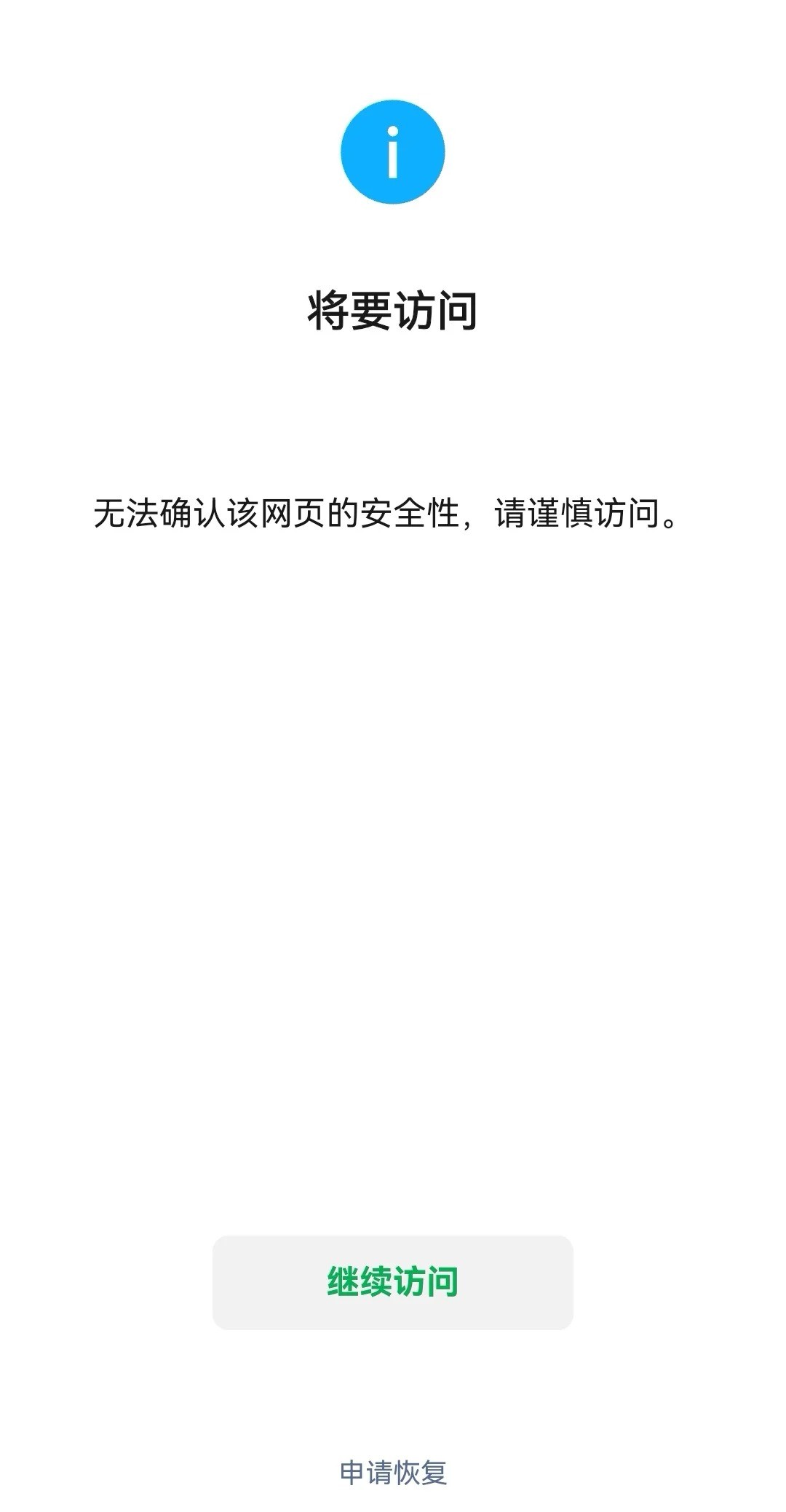 3.另一种就是点击一下网址后需要两次点击,这种说“将要访问无法确定网页安全性”,继续访问可以进入网站,也可以点击申请恢复。但这种一般是针对备案信息的核查,如果你的网站没有做icp备案一般不好恢复或无法恢复,做了icp备案一般就会直接进入,不用二次点击,所以德材翌科技建议大家最好还是备案一下。